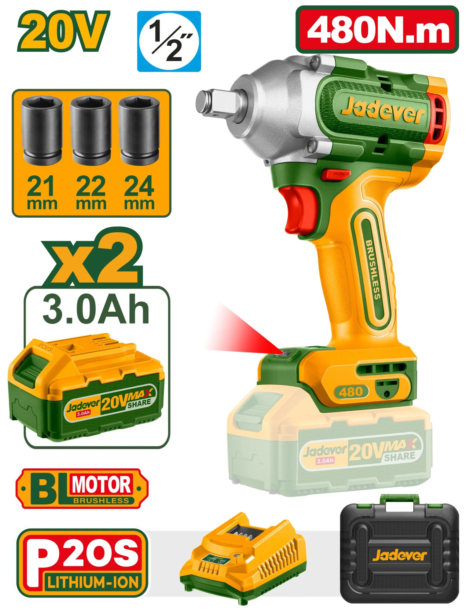 Гайковерт ударный беспроводной на аккумуляторе 20V 2300rpm 170Nm + 2 акк. JDCD2512 Jadever