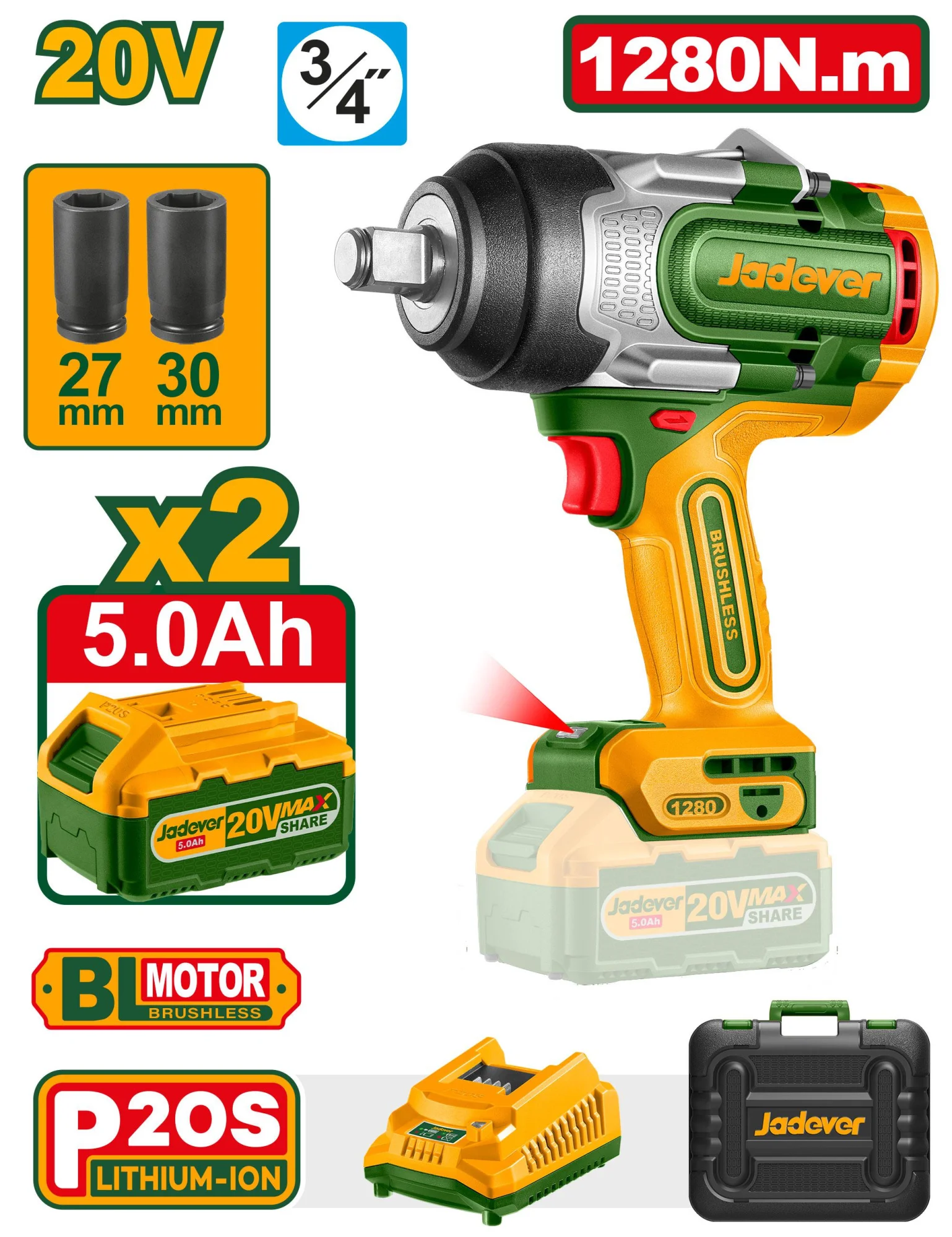 Аккумуляторный ударный гайковерт 20V 1280Nm  JDCD1B128  Jadever